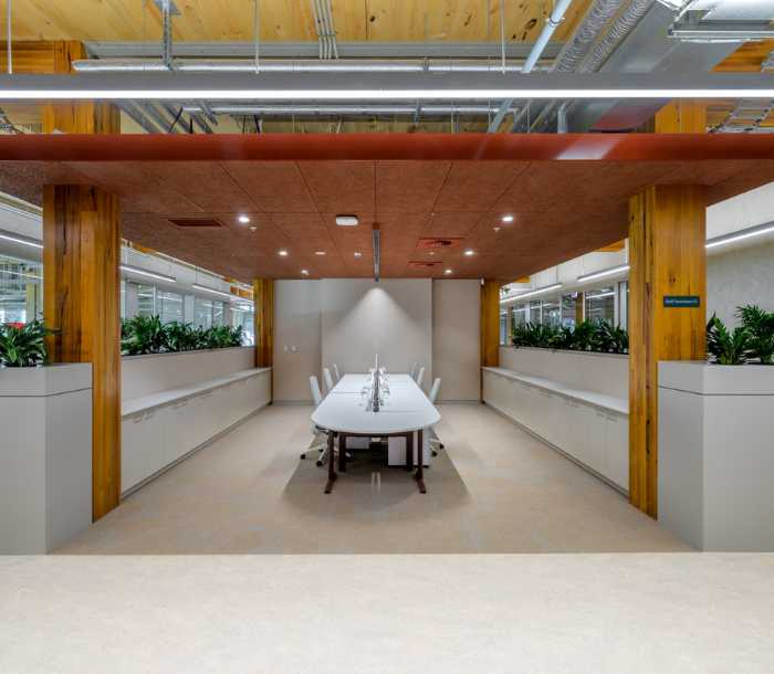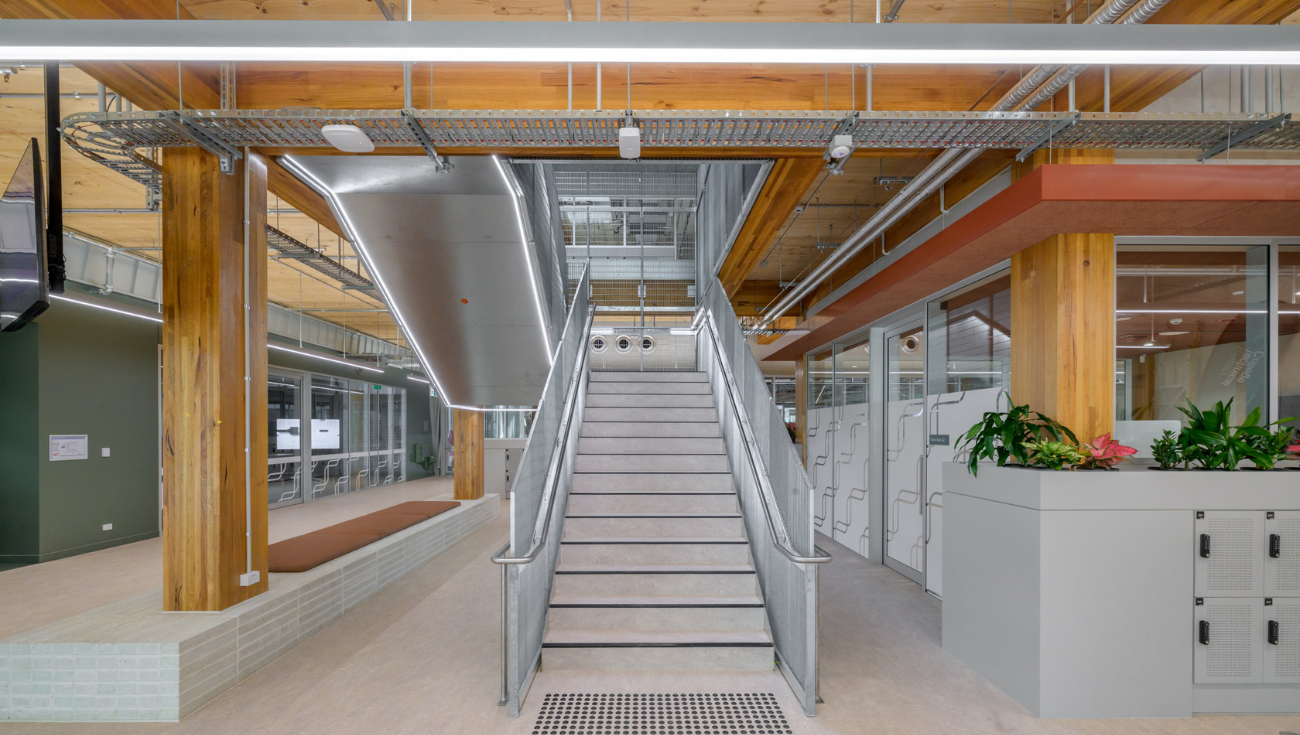 Structure & Materials: CLT/GLT timber, 30% recycled ash concrete, CC2 accredited steel, low-VOC finishes, recycled wood wool ceiling panels, natural marmoleum flooring.